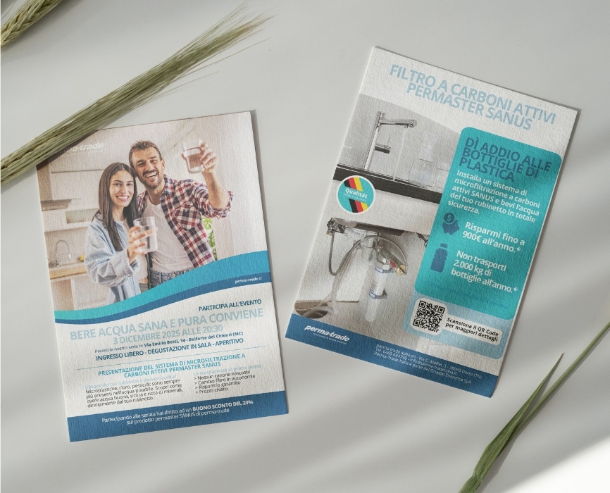 L’acqua è benessere e vita. Ma il suo packaging, la bottiglia di plastica, è tutt’altro! Ecco allora una campagna social fresca e coinvolgente, landing page, immagine corporate, depliant e flyer all’altezza del messaggio, che invitano ad utilizzare un sistema di filtraggio dell’acqua del rubinetto. perma-trade, azienda casa madre tedesca, da sempre etica e originale, ha infatti organizzato la produzione dei propri componenti presso una struttura che impiega ragazzi disabili, portando lavoro concreto e serenità a loro e alle loro famiglie. La stessa etica usata nello sviluppare i filtri a carboni attivi, estremamente efficaci e senza alcun additivo chimico, perfettamente ecologi nel trattamento.